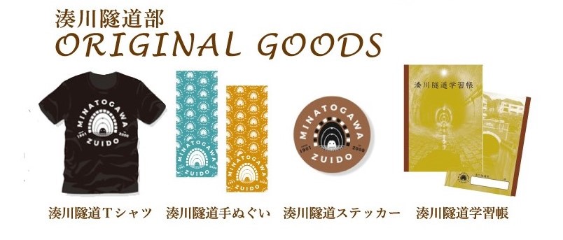 土木やインフラ、超ニッチなものをモチーフにグッズ化しているデザイナー・マニアパレルさんにデザインしていただいたロゴ”湊川隧道くん”がプリントされたTシャツや手ぬぐい、ステッカー、をお持ちします。